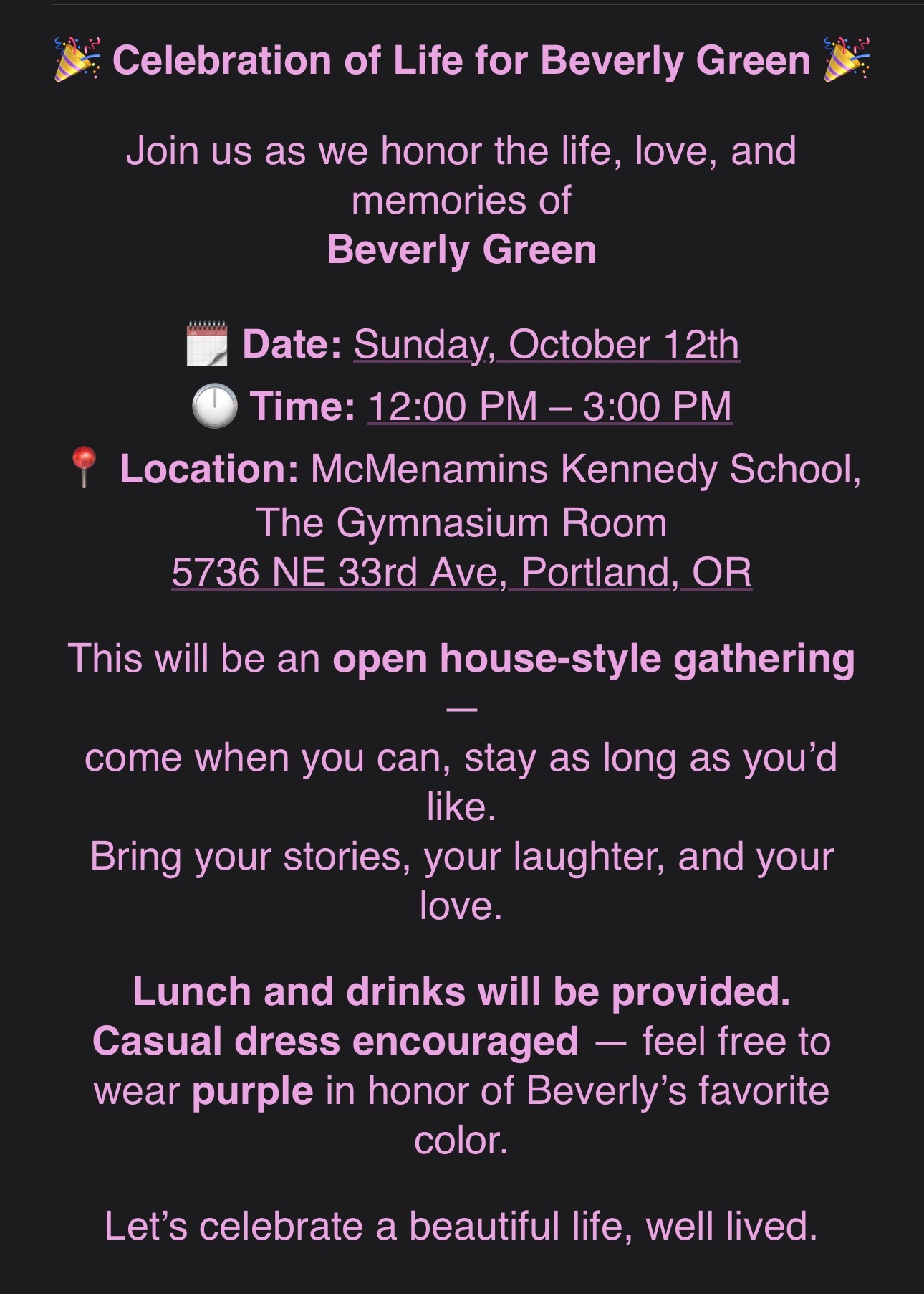 Our thoughts and prayers go out to her family. Details of a memorial to come.